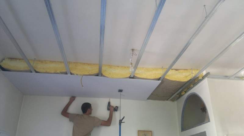 Pose des rails et des montants, pose de lin de verre pour isolation phonique et thermique. Pose de plaque de plâtre phonique. Réalisation de bandes et de deux couches d'enduit de lissage, ponçage de surface avec une girafe pour un meilleur résultat.