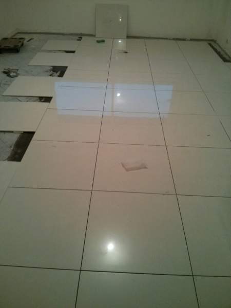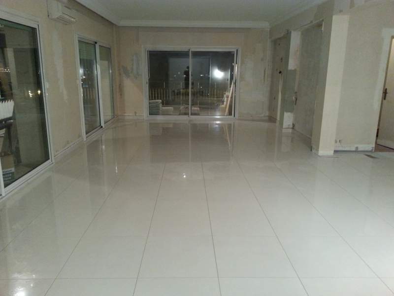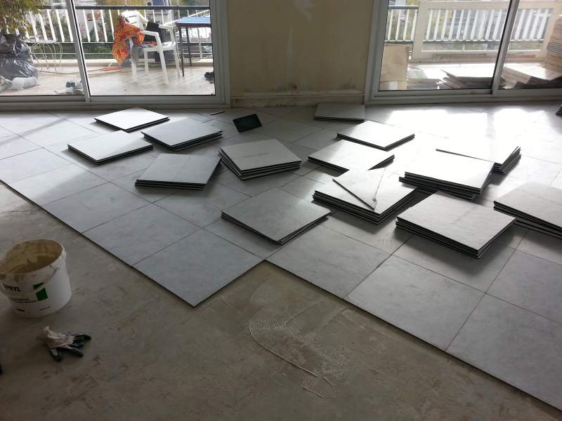 Pose de carrelage grès cérame émaillé dimensions 60x60cm et pose des plinthes, réalisation des joints.