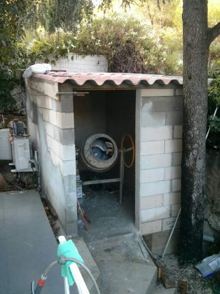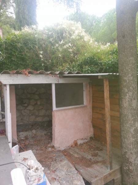 Après le montage du mur avec des parping de 15cm réalisation d'un toit avec des plaques sous tuile, réalisation de l'enduit blanc frotassé. Pose d'une porte en métal.